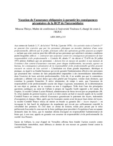 Vocation de l'assurance obligatoire à garantir les conséquences pécuniaires de la RCP de l'intermédiaire.
