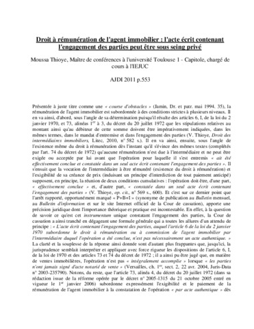 Droit à rémunération de l'agent immobilier : l'acte écrit contenant l'engagement des parties peut être sous seing privé.