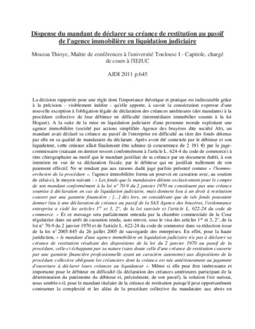 Dispense du mandant de déclarer sa créance de restitution au passif de l'agence immobilière en liquidation judiciaire.