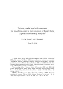 We study the political determination of the level of social long-term care insurance when voters also choose private insurance and saving amounts. Agents di§er in income, probability of becoming dependent and of receiving family help. Social insurance redistributes across income and risk levels, while private insurance is actuarially fair. The income-to-risk ratio of agents determines whether they prefer social or private insurance. Family support crowds out the demand for both social and, especially, private insurance, as strong prospects of family help drive the demand for private insurance to zero. The availability of private insurance decreases the demand for social insurance but need not decrease its majority chosen level.
