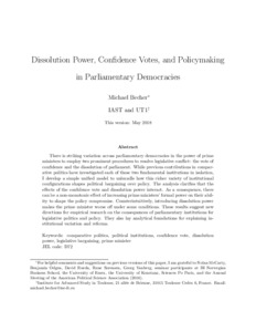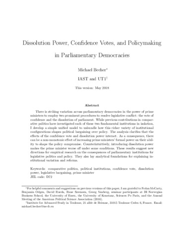 Becher, Michael (2018) Dissolution Power, Confidence Votes, and Policymaking in Parliamentary Democracies WP QUI REVIENT QUAND ON LE SUPPRIME - NN 29082018. IAST Working Paper, n. 18-80