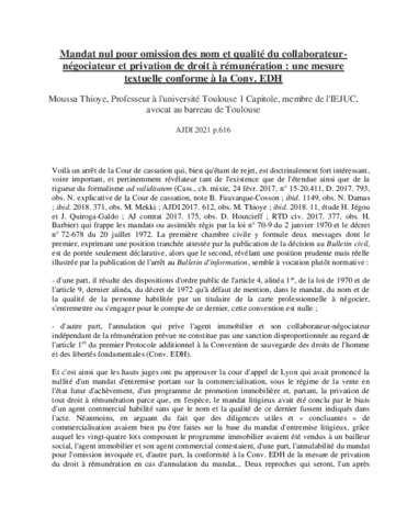 Mandat nul pour omission des nom et qualité du collaborateur-négociateur et privation de droit à rémunération : une mesure textuelle conforme à la Conv. EDH.