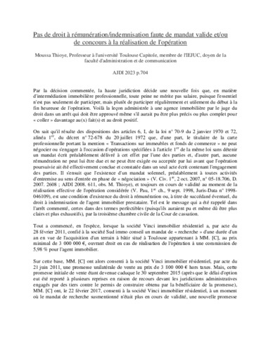 Pas de droit à rémunération/indemnisation faute de mandat valide et/ou de concours de la réalisation de l'opération.