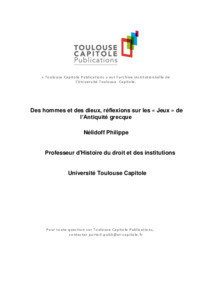 Cette intervention, dans un colloque organisé par des juristes et des collègues de l'Université Paul Sabatier, est une présentation historique des grands concours qui existaient dans l'Antiquité grecque, spécialement à Olympie, Delphes, Corinthe et Némée.
