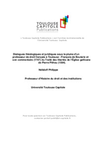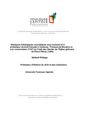 Dialogues théologiques et juridiques sous la plume d'un professeur de droit français à Toulouse : François de Boutaric et son commentaire (1747) du Traité des libertés de l’Église gallicane de Pierre Pithou (1594).