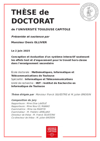 ,Research in cognitive psychology has identified two effects that promote long-term retention of knowledge. The testing effect is observed when testing on knowledge instead of re-reading it (Bae et al., 2019; Zaromb & Roediger, 2010). The spacing effect is seen when working moments are spaced rather than concentrated at the same time (Cepeda et al., 2006; Rohrer & Taylor, 2006). The students’ work to consolidate their out-of-class learning is partially based on revisions. However, the literature shows that students are victims of metacognitive “illusions” and underestimate the value of spaced tests (Yue, 2020). They favor re-reading (Roediger III & Karpicke, 2006), and mass review near summative evaluations (Blasiman et al., 2017; Latimier, 2019). The tools supporting these effects out-of-class or in-class (Silvestre, 2015; Wang & Tahir, 2020), are not designed for revision work adapted to the institutionalized context. In addition, there are few studies on the use of digital to support revisions in an real school (Latimier, 2019). The objective of our thesis is to formulate recommendations for the designof interactive systems supporting testing and spacing effects in revisions, while being adapted to secondary education. The research presented provide answers to the following research questions:QR 1 : What effective secondary school student revision practices can beinferred from the usage traces of an interactive review system?QR 2 : What recommendations, based on the analysis of the actual revisionpractices identified and supporting testing and spacing effects, can be madeto improve the design of an interactive system for secondary school students’revisions?The Design-Based Research (DBR) cycle carried out during our thesis began with a qualitative study aimed at identifying the needs of students and teachers, as well as formulating our scientific hypotheses. From these assumptions, we derived specifications that guided the design of a first version of an interactive system supporting revisions. Finally, a quantitative study in the middle school (4 teachers, 297 students) allowed to evaluate this system to test these hypotheses in an ecological context. The results of this study allowed us to shed light on the practices (P) of students with out-of-class work and draw design recommendations (R) :(P1) Students use computers and mobile devices to study with a digital tool insignificant ways, with a clear trend towards computers.(R1) The tool should ensure equivalent accessibility on desktop and mobile, takinginto account students’ strong preference for the computer as part of their revisions.)(P2) When students revising with digital tools have both a test tool and a re-readingtool, the majority of them use the test tool.(R2) The tool must offer ready-to-use tests: the simple provision of a system offeringready-to-use tests on the concepts discussed in class encourages students willing torevise with a digital tool to prefer the test to re-reading on these same concepts.(P3) In the absence of incentives, students prefer a strategy of massed work closeto summative evaluation, and benefit little or not at all from the spacing effect.(R3) The tool should help regulate student activity.The research continues through a new thesis on the development of incentives for revisions with spaced tests, whether directly integrated into the system or facilitated by enhanced supervision of teachers.