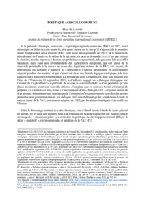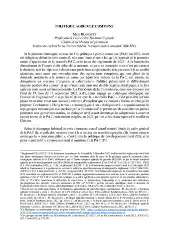 La chronique présente de façon détaillée la Politique agricole commune de l'Union européenne sur l'année 2023, tant dans ses aspects institutionnels que matériels, et à la fois pour l'aspect interne et l'action internationale.