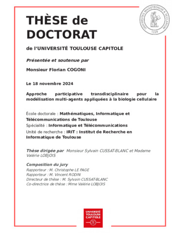 Cogoni, Florian (2024) Approche participative transdisciplinaire pour la modélisation multi-agents appliquée à la biologie cellulaire. École doctorale Mathématiques, Informatique et Télécommunications (Toulouse).