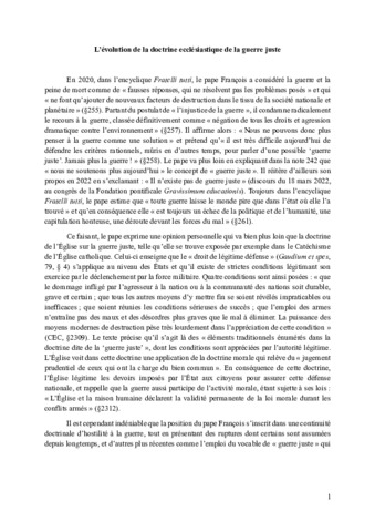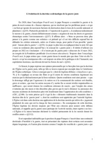 La doctrine ecclésiastique de la guerre juste est le fruit d'une longue évolution, qui s'ancre fermement dans la pensée de saint Augustin, transmis aux canonistes par le truchement du Décret de Gratien. Au XXIe siècle, cette doctrine connaît une évolution notable avec une prise de position du pape François qui s’inscrit à la fois dans une continuité doctrinale d’hostilité à la guerre, tout en présentant des ruptures dont certains sont assumées depuis longtemps, et d’autres plus récentes comme la disparation du vocable de « guerre juste » dans les documents ecclésiastiques depuis Vatican II, ou encore l'opposition de principe à l'idée même de guerre juste propre à François.