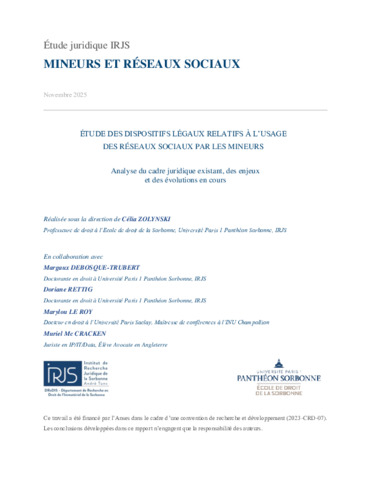 ETUDE DES DISPOSITIFS LÉGAUX RELATIFS À L’USAGE DES RÉSEAUX SOCIAUX PAR LES MINEURS. Analyse du cadre juridique existant, des enjeux