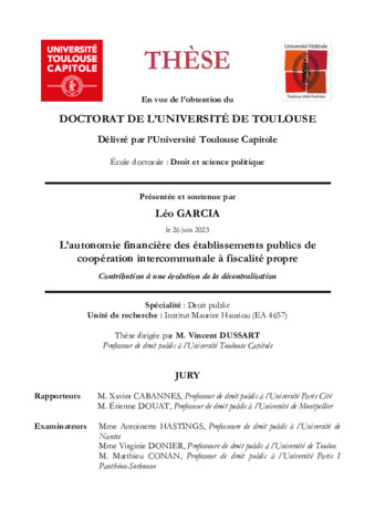 Garcia, Léo (2023) L’autonomie financière des établissements publics de coopération intercommunale à fiscalité propre : contribution à une évolution de la décentralisation. École doctorale Droit et Science Politique (Toulouse).