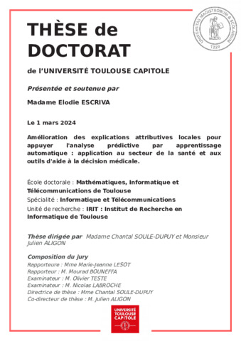 Escriva, Elodie (2024) Amélioration des explications attributives locales pour appuyer l'analyse prédictive par apprentissage automatique : application au secteur de la santé et aux outils d'aide à la décision médicale. École doctorale Mathématiques, Informatique et Télécommunications (Toulouse).
