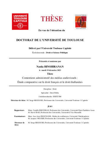 Hinshiranan, Natda (2023) Contentieux administratif des médias audiovisuels : Étude comparative sur le droit français et le droit thaïlandais. École doctorale Droit et Science Politique (Toulouse).