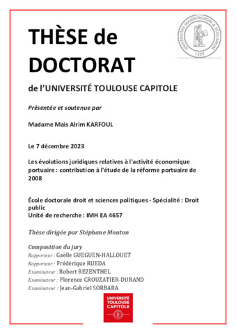 Karfoul, Mais Alrim (2023) Les évolutions juridiques relatives à l'activité économique portuaire : contribution à l'étude de la réforme portuaire de 2008. École doctorale Droit et Science Politique (Toulouse).