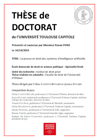 Pons, Ronan (2024) La preuve en droit des systèmes d'intelligence artificielle. École doctorale Droit et Science Politique (Toulouse).