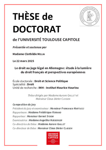 Melin, Clothilde (2025) Le droit au juge légal en Allemagne : étude à la lumière du droit français et perspectives européennes. École doctorale Droit et Science Politique (Toulouse).